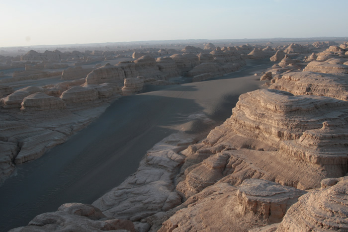 “雅丹”是罗布泊地区一种典型的地貌,亦称“雅尔当”,原是罗布泊地区维吾尔族人对“险峻山丘”的称呼。19世纪末20世纪初,瑞典探险家斯文赫定和英国人斯坦因,先后来罗布泊地区“考察”,在其撰文中提到“雅丹”一词,于是“雅丹”就成为世界地理工作者和考古学家通用的术语。“雅丹”是由“水退式层系”期在水和风力的作用下形成的各种形状的土阜,“雅丹”地貌在罗布泊分布很广,在罗布泊西岸有楼兰“雅丹”和“龙城雅丹”;东北有“白龙堆雅丹”;东部有三垅沙“雅丹”,尤以罗布泊西北岸的“龙城雅丹”著名。这片风蚀地,面积约2600平方公里,是一片高大的风蚀土台群,土台高约10----20米不等。由于罗布泊地区常年风大风多,天长日久,土台与沟谷星罗棋布,鳞次结比。在夕阳的映照下,土台变幻出各种姿态,时而像一只庞大的船队,气势雄伟,千万只船鼓帆而来;时而又像无数条鲸鱼,在沙海中翻滚腾舞,摇尾嬉戏;时而又像座座楼台亭阁,斗奇竟丽;时而又像古城寨堡,争雄对峙。置身于土台群中,仿佛进入了扑朔迷离、异常深远幽静的大街小巷,面目皆是神秘、奇特、壳里的“亭台楼阁”,使人沉思遐想、流连忘返。在古老的传说中,往往把这里的“雅丹”称作“龙城”。相传遥远的年代,罗布泊附近有个国家,其城之大:“朝发东门,幕达西门”(即从东门到西门要走一天的路),其国百姓们衣不蔽体,食不果腹,而国王却花天酒地,骄奢淫逸,玉皇大帝得知此事,便扮作和尚下凡“化缘”,昏庸无道的国王仅施舍了一点盐巴。玉皇大帝勃然大怒,调来盐泽水(《史记》称罗布淖尔为盐泽)淹没了这个国家,水退后出现了“龙城”;元代,意大利旅行家马可。波罗来过罗布泊地区,他在记文中写道:“沿途尽是沙山沙谷,无食可觅,禽兽绝迹,行人夜中骑行……则闻鬼语……”(《马可•波罗行记》),现今登高望去,“龙城”繁星般的土丘,有的拔地突立,傲视苍弯;有的迤逦起伏,昂首翘尾。丘陵沟壑中,鹅黄色的沙堆绵延起伏,金波粼粼,恰似锦缎;闯入龙城,极易迷路,其间“亭台阁榭”、“街巷通衢”,深邃幽僻。月白风清之夜,宿营“龙城”中,颇觉眼前景物,不是古城,胜似古城,使人悠然想起岑参的诗句:“官军西出过楼兰,营幕傍临月窟寒,蒲海晓霜凝马尾,葱山夜雪扑旌杆”。“雅丹”地貌区有极久远的人类遗迹,在距今10000~40000年的新石器时代,即有人类活动,干燥的气候,闭塞的环境,使这里成了天然的“文物宝库”。虽然中外考古学家在罗布泊发现了世人瞩目的“楼兰古城”、“土垠遗址”和新石器时代以来的大量古代文物,这些遗址当年就建在“雅丹”凹地或高台之上,但在世界考古学家们眼中,“雅丹文物”仍是一个未知数,都想前去探寻其中奥秘。走进“雅丹”,你就走进了一座国家地质公园,走进“雅丹”你就走进了一座天然国家历史文物馆。