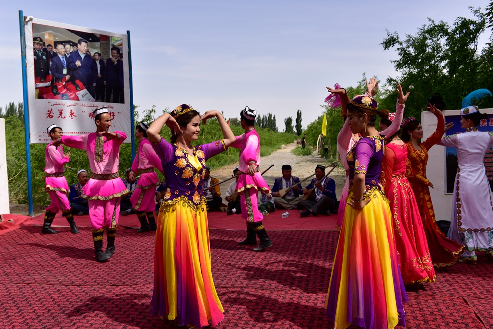 上图为“若羌赛乃姆”活动中 维吾尔大叔弹都塔尔